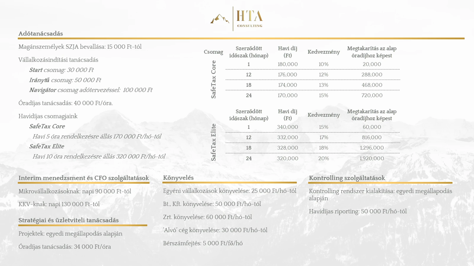 Havi díjas ajánlatainkat minden esetben személyre szabjuk, ugyanakkor egységes elveket alkalmazva, azonos lépések mentén dolgozzuk ki magánszemélyek, egyéni és társas vállalkozások esetén egyaránt.
